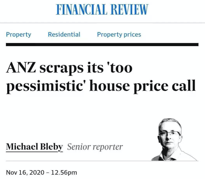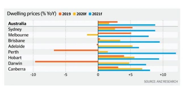 澳新银行(ANZ)取消了大流行造成房价下跌10%的预期,并表示,刺激措施和创纪录低利率引发的人气飙升,将抑制房价下跌,甚至可能导致今年房价出现“温和”上涨。
